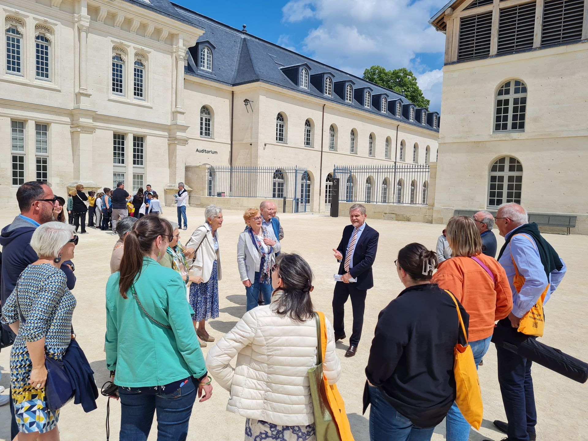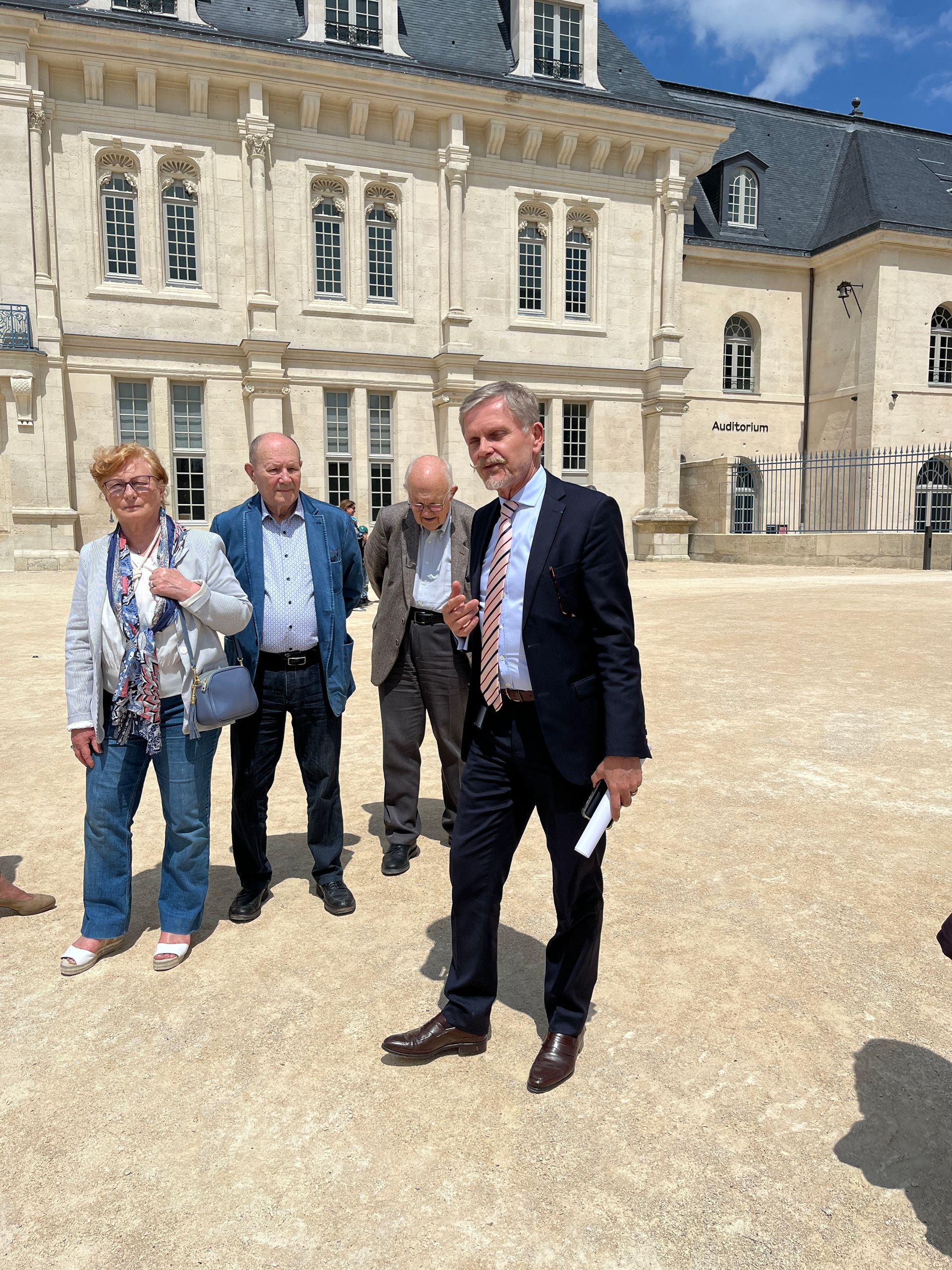 Après le déjeuner, nous avons été accueillis par Xavier Bailly, Administrateur du Centre des monuments nationaux, qui nous a offert une visite VIP du château de Villers-Cotterêts. Cet édifice, marqué par l’ordonnance de Villers-Cotterêts signée en 1539 par François Ier, est un symbole fort de l’histoire de la langue française. M. Bailly nous a expliqué en détail l’histoire du château et sa récente transformation en Cité internationale de la langue française, un projet ambitieux initié par Emmanuel Macron.